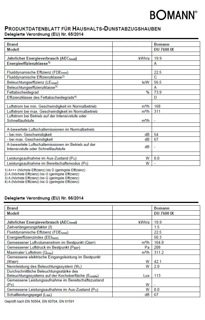 - Energieverbrauch / Jahr: 20kWh (gem. EU-Datenblatt nach Verordnung Nr. 65/2014)