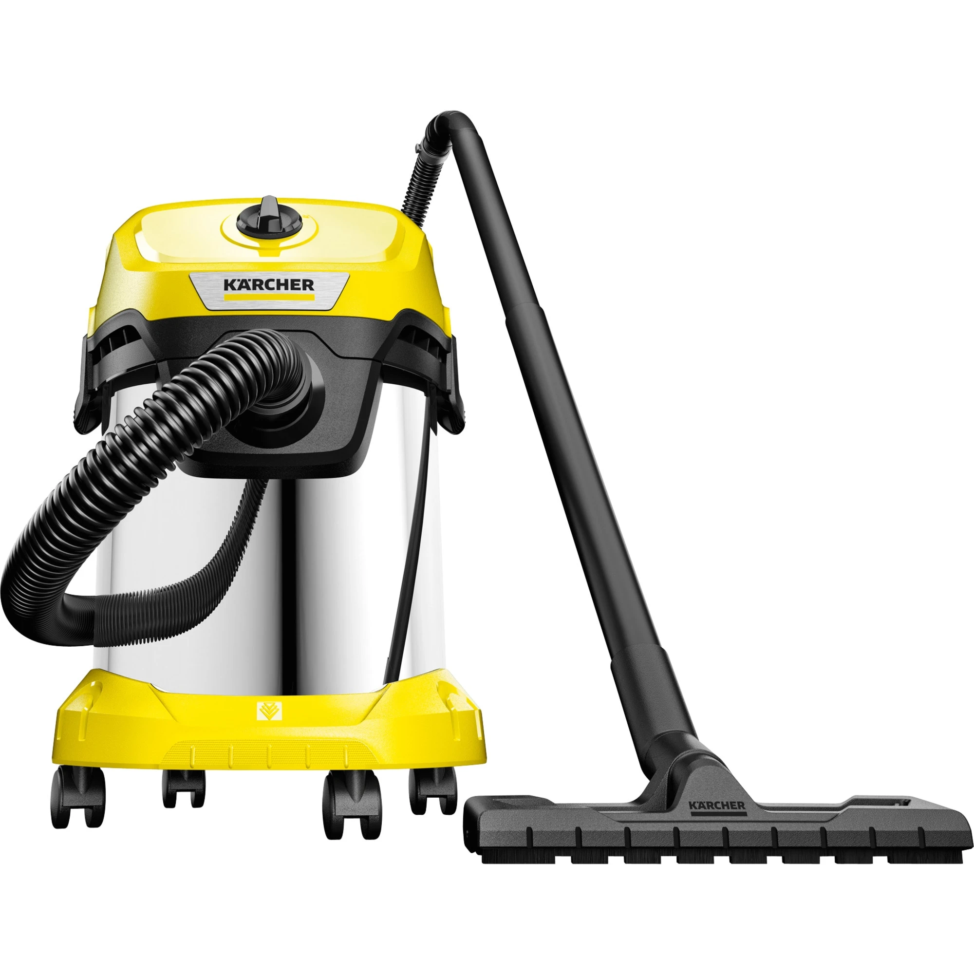 Der WD 3 S V-17/4/20 ist mit 1000 Watt besonders saugstark. Dabei sind sowohl das Gerät als auch der Saugschlauch und die Clips-Bodendüse optimal aufeinander abgestimmt – für die besten Reinigungsergebnisse bei trockenem, nassem, feinem oder grobem Schmutz. Der Nass-/Trockensauger überzeugt mit seiner kompakten Bauweise und einem robusten 17-Liter-Edelstahlbehälter, 4 m Kabel, 2 m Saugschlauch und seinem Vliesfilterbeutel. Dank des einteiligen Patronenfilters ist das Aufsaugen von sowohl nassem als auch trockenem Schmutz ohne Filterwechsel möglich. Die Blasfunktion ist nützlich beim Reinigen von schwer zugänglichen Stellen. Die Aufbewahrung des Schlauchs erfolgt platzsparend durch das Einhängen am Gerätekopf. Das Kabel kann am Kabelhaken verstaut werden, Rohre und Bodendüsen am Bumper. Das „Pull & Push“-Verschlusssystem ermöglicht einfachstes Öffnen und Schließen des Behälters. Der Handgriff des Saugers kann abgenommen und das Zubehör direkt auf den Saugschlauch gesteckt werden. Ebenfalls clever: Auf der Fläche auf dem Gerätekopf können Werkzeuge oder Kleinteile abgelegt werden. Der ergonomisch geformte Tragegriff ermöglicht den komfortablen Transport.