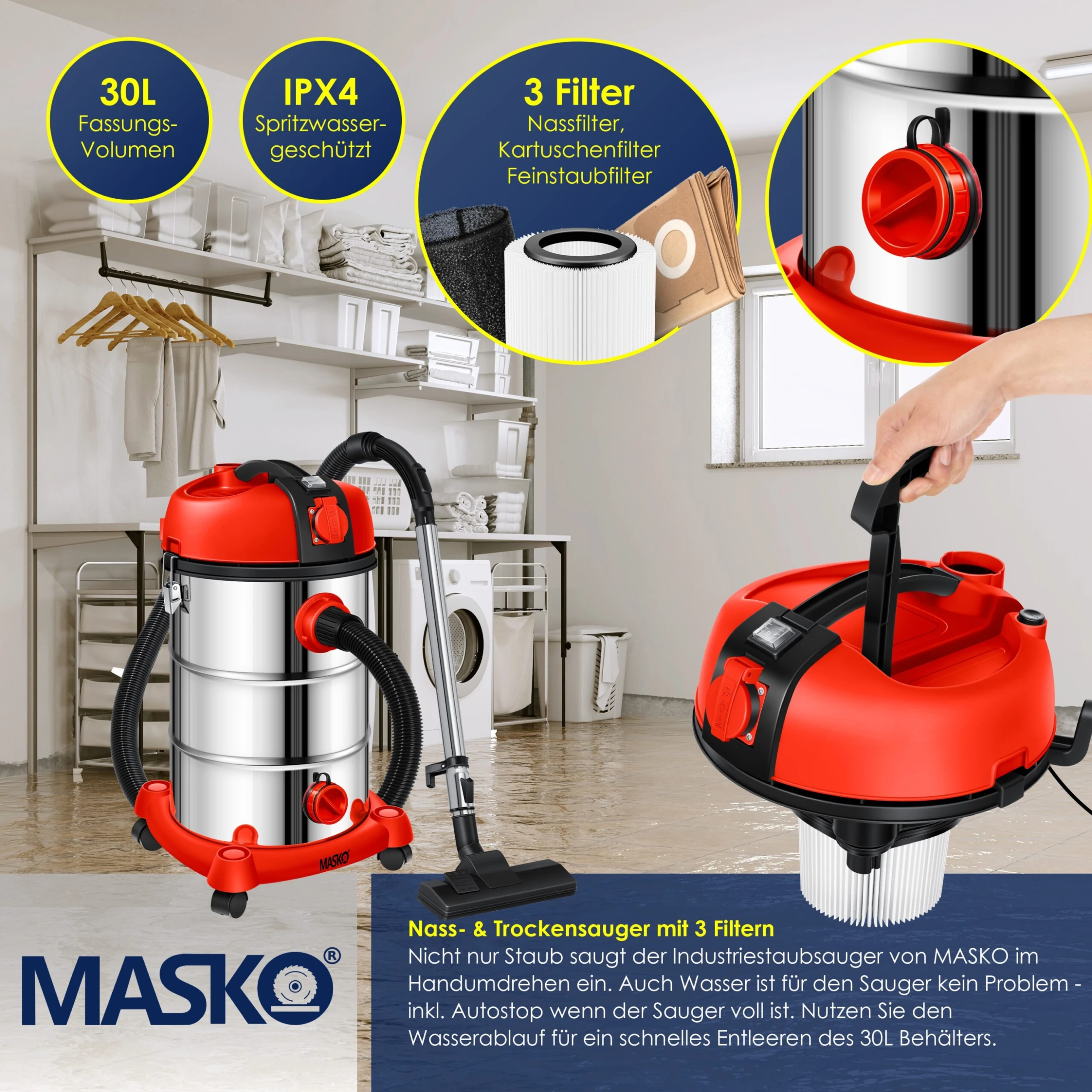 Wasser, Staub und Schmutz sind keine Herausforderung für den leistungsstarken Staubsauger der Marke MASKO. Dank mitgelieferter Fugenbürste, Bodendüse für raue und glatte Oberflächen sowie des 7m großen Arbeitsradius auf flexiblen Leichtlaufrollen werden Sie in keiner Situation Probleme beim Säubern haben.