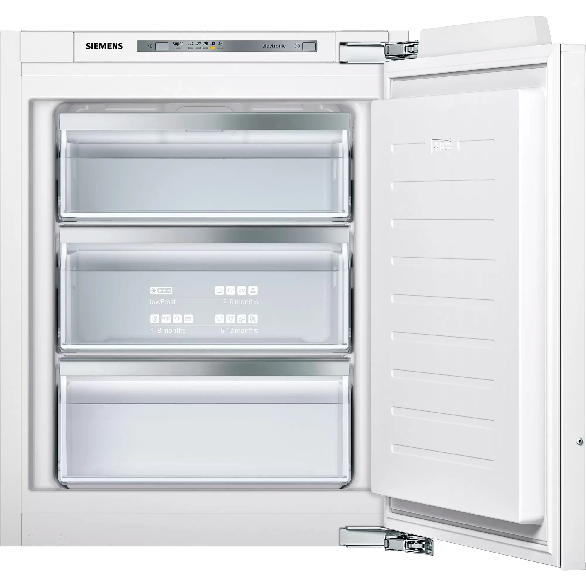 Der Einbau-Gefrierschrank GI11VAFE0 stellt einen Gesamtnutzinhalt von 72 Litern zur Verfügung und lässt sich dank seiner kompakten Maße auch in kleine Küchen integrieren. Er ist mit drei transparenten Gefriergutschubladen ausgestattet. Die lowFrost-Technologie mit ihrem Spezialverdampfer reduziert die Eisbildung auf ein Minimum, sodass Energie und Arbeit beim Abtauen gespart wird. Die SuperGefrieren-Funktion mit Eingefrierautomatik schützt bereits Gefrorenes beim Einlagern frischer, wärmerer Lebensmittel und freshSense sorgt im gesamten Innenraum für eine konstante Temperatur durch intelligente Sensortechnik. Die Tür des GI11VAFE0 schließt dank softClosing automatisch und sanft, wenn der Öffnungswinkel maximal 20° beträgt. Mit einem Stromverbrauch von 167 kWh im Jahr ist der GI11VAFE0 in die Energieeffizienzklasse C eingestuft.