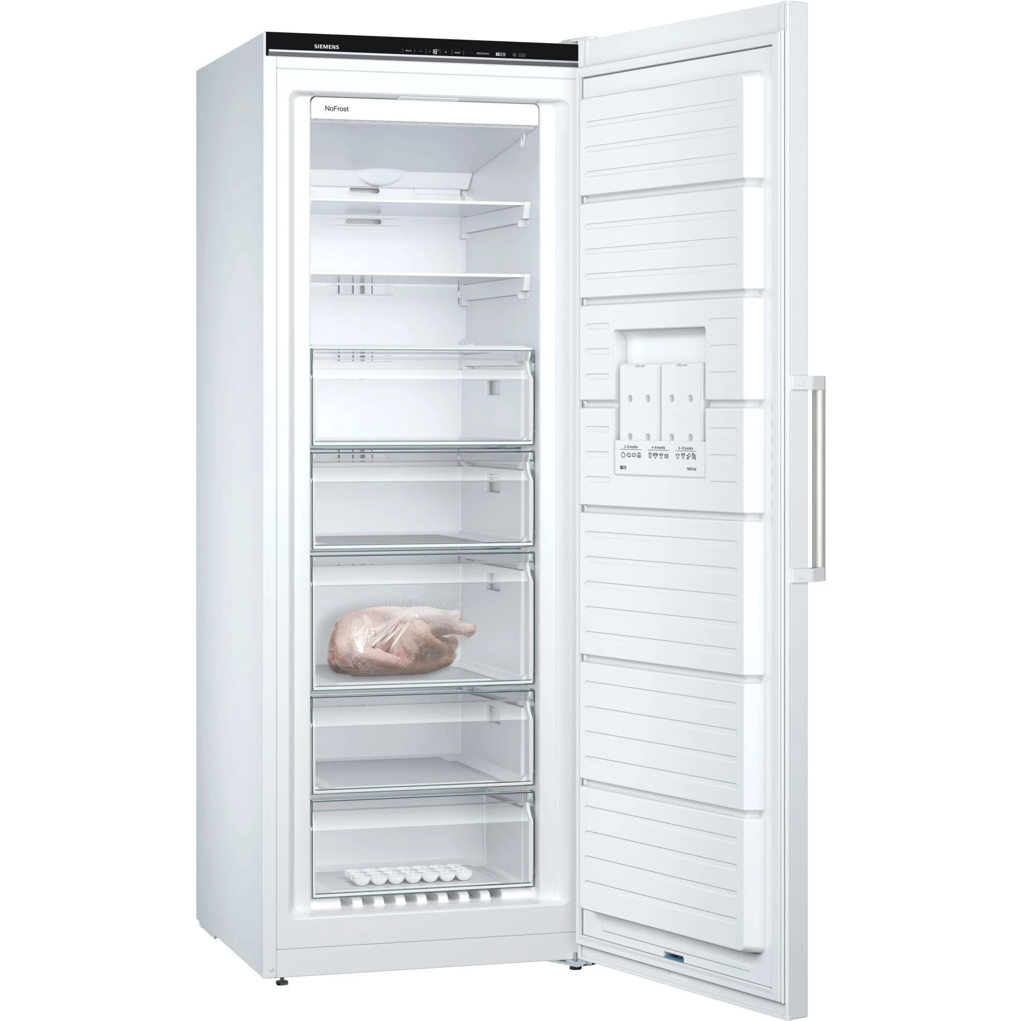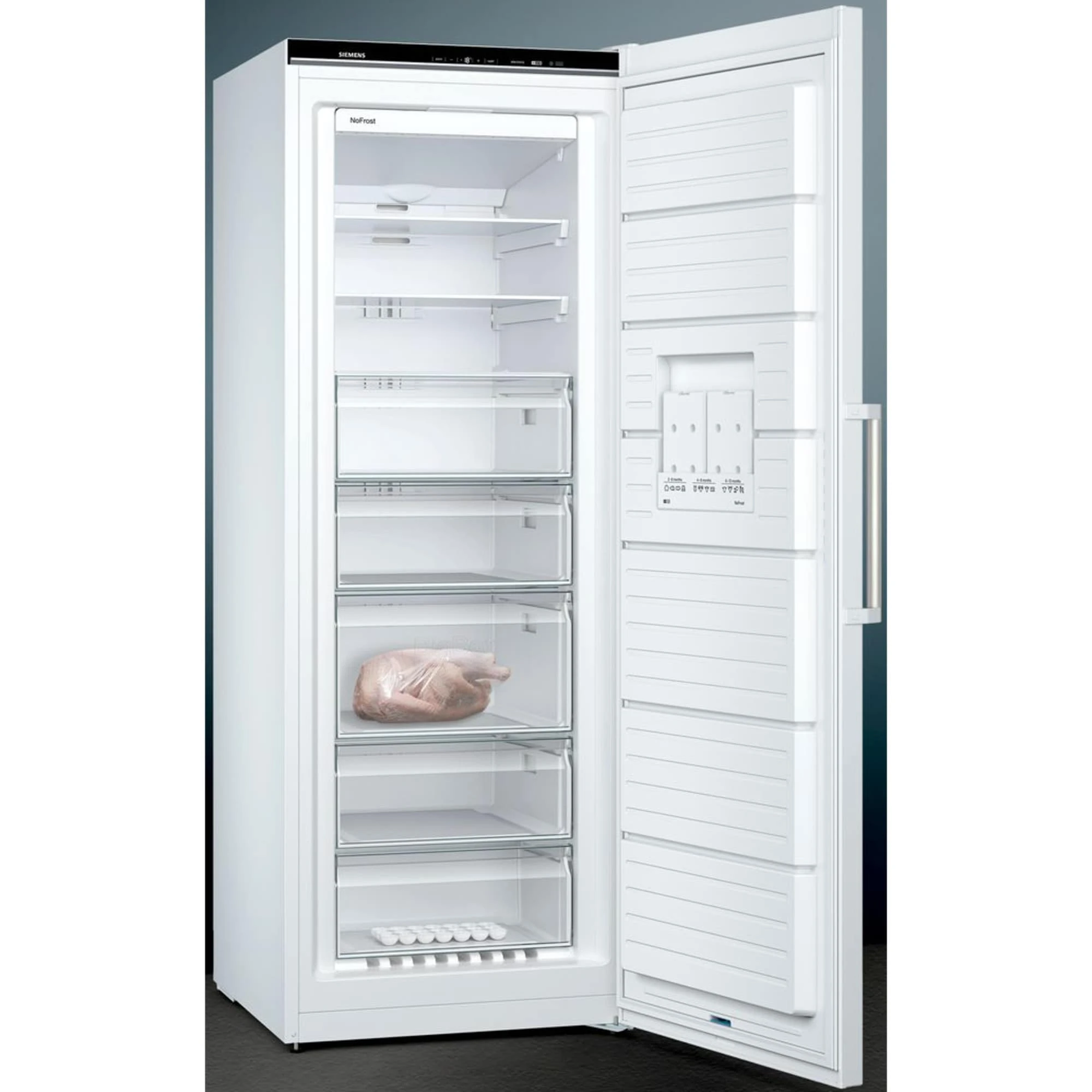Der Gefrierschrank Siemens GS58NDWDP ist mit einem Gesamtnutzinhalt von 366 Litern ideal für den großen Haushalt geeignet. Er stellt fünf transparente Gefrierschubladen, davon eine bigBox zum Stapeln von Einfrierbehältern oder für großes Gefriergut, zur Verfügung, die dank varioZone einfach herausnehmbar sind und sich flexibel auf die persönlichen Platzansprüche einstellen lassen. Mit der noFrost-Technologie wird mühsames Abtauen überflüssig und das MultiAirflow-System sorgt für optimale und gleichmäßige Kälteverteilung. freshSense ermöglicht eine konstante Temperatur durch intelligente Sensortechnik und die SuperGefrieren-Funktion mit Eingefrierautomatik schützt bereits Gefrorenes beim Einlegen frischer Lebensmittel vor dem Antauen. Die Temperaturregelung des GS58NDWDP erfolgt mittels Touchcontrol-Elektronik und ist digital ablesbar.