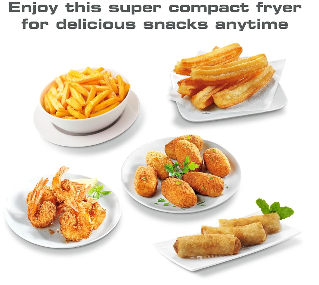 Principio ist eine kompakte Fritteuse von Tefal. Und doch hat sie es in sich ! Mit der Principio können Sie bis zu 600 g Pommes frites mit nur 1,2 Liter Öl zubereiten. Das spart Öl, Zeit und sogar Energie, da sie nur 1.000 W Leistung benötigt. 600 g Pommes frites sind mehr als genug für 2 Personen, aber für Ihre Gäste zuhause kann Principio auch für die Zubereitung von Tapas und allen Arten von frittierten Speisen verwendet werden : Samosas, Kroketten, Falafel, frittierter Fisch, Churros oder Donuts … Mit der Principio Fritteuse wird es Ihnen nie an Ideen mangeln !