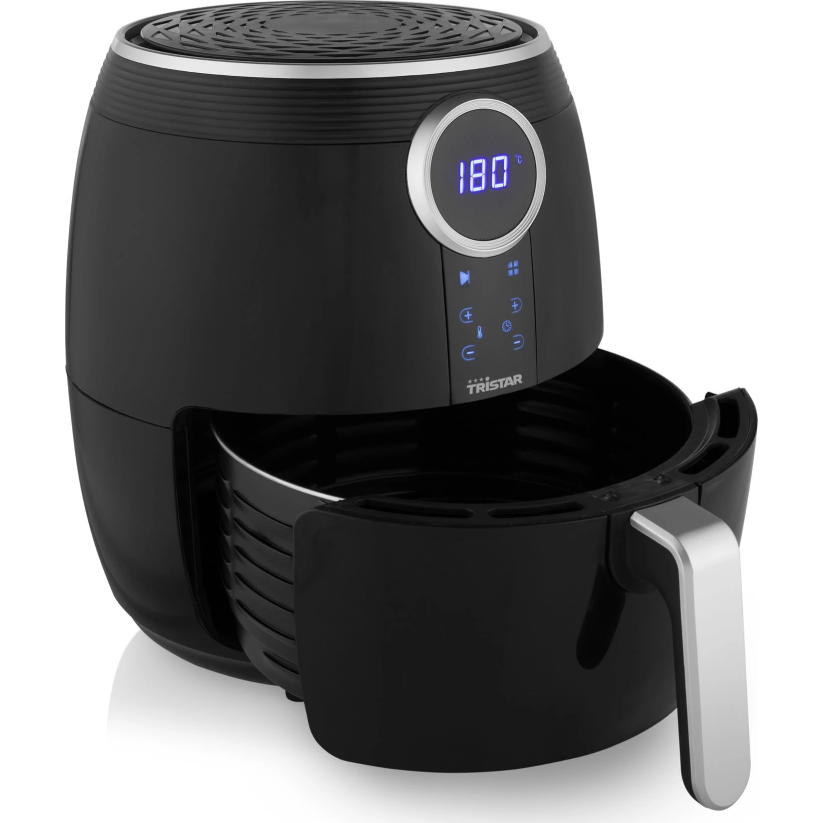 Mit einem Volumen von 4,5 Litern ist der FR-6956 Digital Crispy Fryer die perfekte Heißluftfritteuse für die ganze Familie. Der einzigartige Crispy Fryer verfügt über ein digitales Bedienfeld mit LCD-Bildschirm, wodurch die Fritteuse besonders einfach zu bedienen ist. Der Crispy Fryer verfügt über 8 Automatik-Programme, man kann aber auch selbst Zeit und Temperatur einstellen. Die Temperatur kann von 80 °C bis 200 °C und der Timer mit einem Alarm nach bis zu 60 Minuten eingestellt werden. Dank einer Leistung von 1500 Watt ist die Fritteuse sehr schnell einsatzbereit. Der Tristar Digital Crispy Fryer hat ein besonders großes Fassungsvermögen, so dass bis zu 1,2 kg Pommes gleichzeitig zubereitet werden können: Genug für die ganze Familie! Dank seiner Technologie, bei der heiße Luft mit hoher Geschwindigkeit zirkuliert, erhält man ein sehr knuspriges Ergebnis, ganz ohne oder mit ein wenig Öl. Der Crispy Fryer ist jedoch vielseitig einsetzbar und eignet sichr außerdem zum Backen, Grillen oder Braten. Auf diese Weise können problemlos Fleisch- oder Fischgerichte und Gemüse in der Heißluftfritteuse zubereitet werden, außerdem Sandwiches, Kuchen oder Torten. Für zusätzlichen Komfort ist der Tristar Digital Crispy Fryer mit einer Antihaftbeschichtung versehen, die sehr pflegeleicht ist. Da sich der Korb problemlos aus dem Crispy Fryer entnehmen lässt, ist die Reinigung auch in kürzester Zeit erledigt. Für Sicherheit sorgen ein Überhitzungsschutz und rutschfeste Füße. Darüber hinaus lässt sich der Korb mit dem „Cool Touch“-Griff sicher aus dem Crispy Fryer entnehmen.