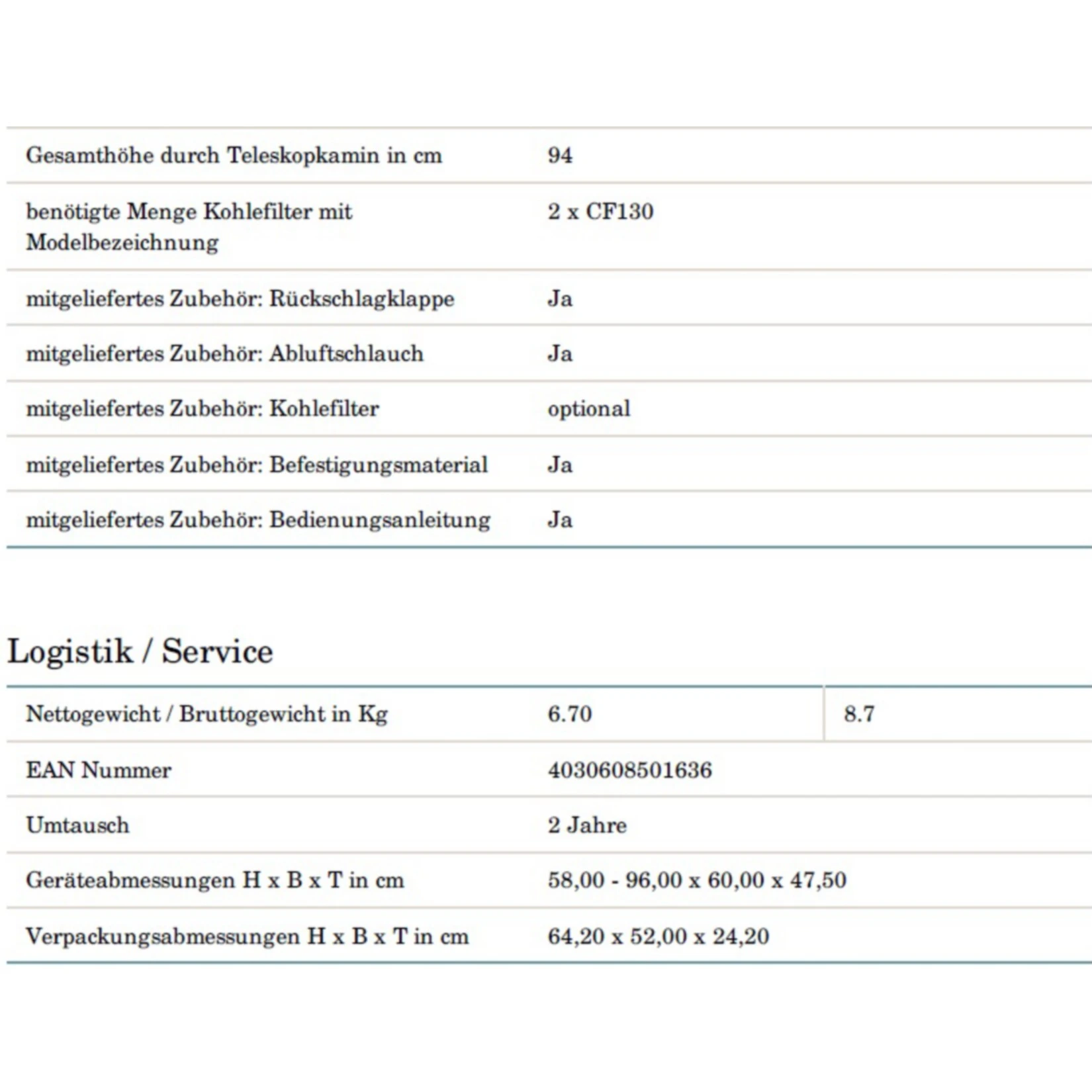 Gesamthöhe durch Teleskopkamin: 96,00 cm